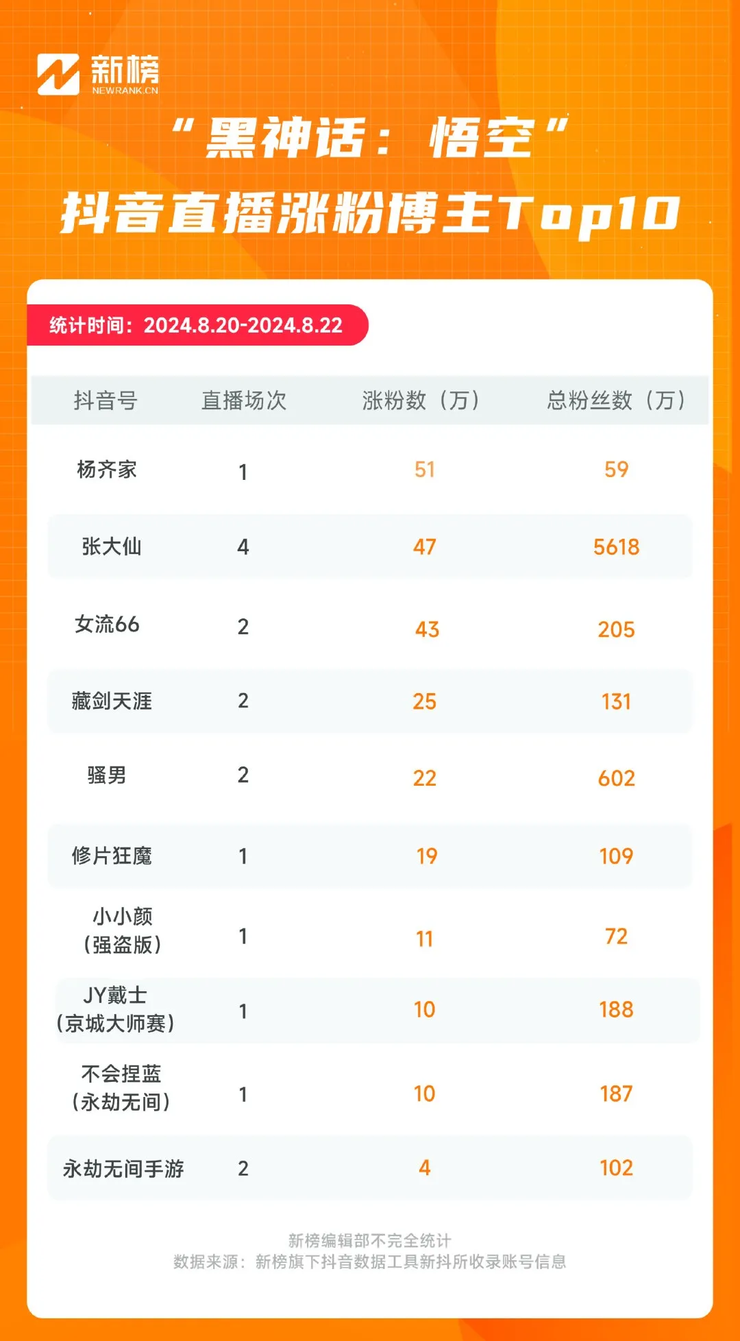 比較出圈的是抖音上直播通關的“楊齊家”,他目前粉絲59萬,**但其中的51萬是過去3天漲的,**等於直接靠《黑神話:悟空》幹起來一個大號(也有統計顯示他在此之前只有2000粉絲)。