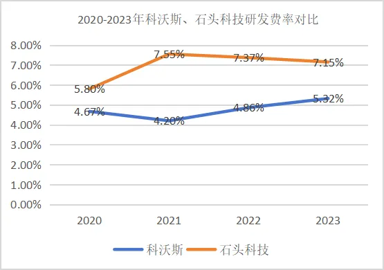 對科技企業來説,面對日新月異的智能化生態,持續的創新研發費用是保持競爭力的核心。而相比同類品牌,近年科沃斯的研發投入比並不高,長期在5%上下徘徊。2023年雖整體費用稍提升,但佔比仍低於其競品。
