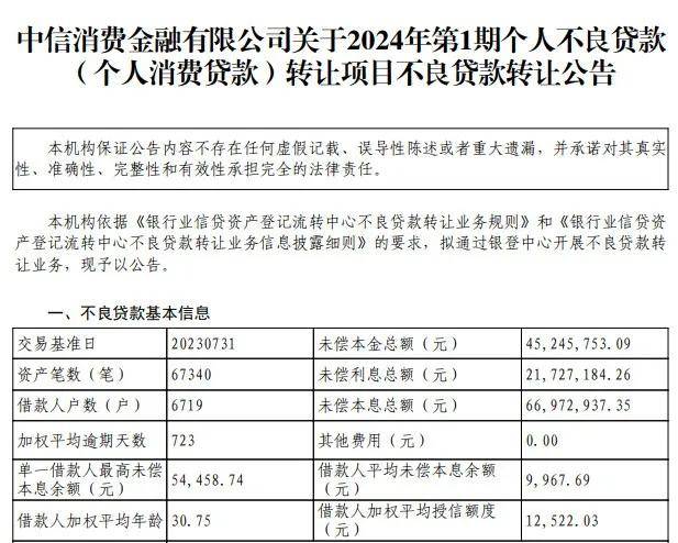 2024年,中信消費金融首次轉讓不良貸款。從其2024年第1期個人消費貸款轉讓項目不良貸款轉讓公告來看,本次擬轉讓未償本息總額為6697.29萬元,初始轉讓價格為239.80萬元。