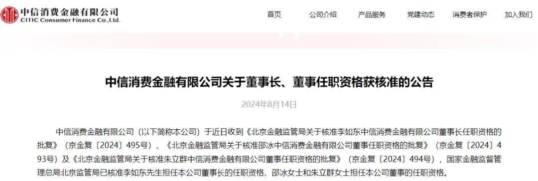 8月14日,中信消費金融在官網上公告稱,國家金融監督管理總局北京監管局公示了中信消費金融董事長任職資格的批覆,核准李如東擔任中信消費金融董事長的任職資格。