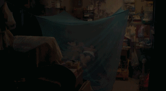 是以姥姥平躺在病牀上,望向外孫的視角。