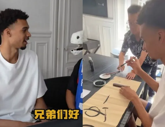 8月12日,NBA的“超級新星”文班亞馬就在某音進行了自己的直播首秀,收穫了百萬點贊。在直播間,文班亞馬對着萬千同胞一口一個“謝謝兄弟們”,還即興寫了幅毛筆字。