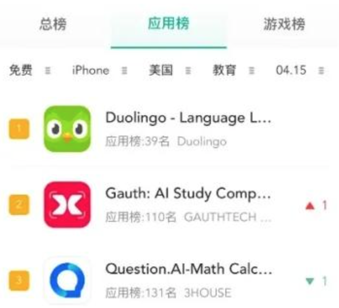 其實,自今年年初以來,Question AI和Gauth就已經是美區應用商店下載排行榜的常客,巔峯時期更是雙雙躍居教育類應用前三,成為僅次於多鄰國的熱門教育APP。