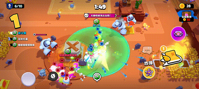 其次是操作的極致簡化,這次的《爆裂小隊》從底子裏能夠看出帶有一點《荒野亂鬥》的影子:同樣的固定視角,在操作上也採用了最基本的單輪盤移動+點觸釋放技能。但是《爆裂小隊》並不需要像荒野亂鬥那樣追求技能釋放準度,不誇張地説,即使玩家單手遊玩,也不會對操作造成很大的影響。