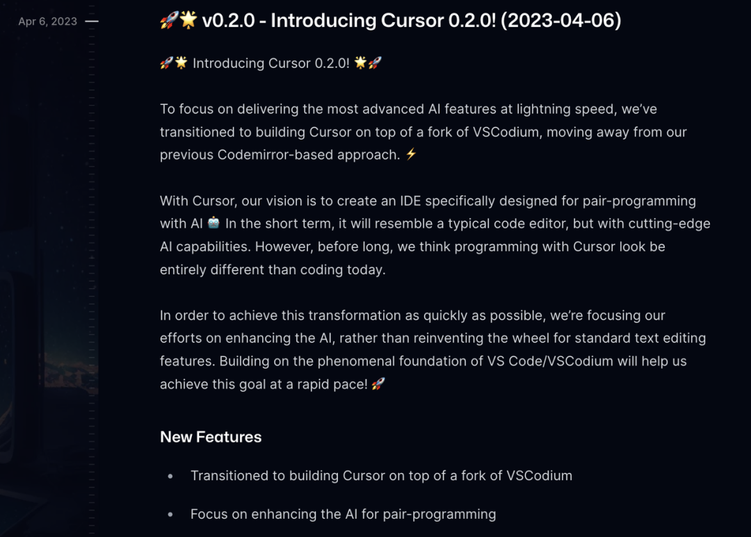 最初,Cursor 基於 Codemirror 構建,但為了專注於開發尖端 AI 功能,並打造一個原生支持 AI 配對編程的集成開發環境(AI-native IDE),Anysphere 將 Cursor 遷移至 VSCodium 的一個分支上,即微軟 Visual Studio Code(VS Code)的開源版本。