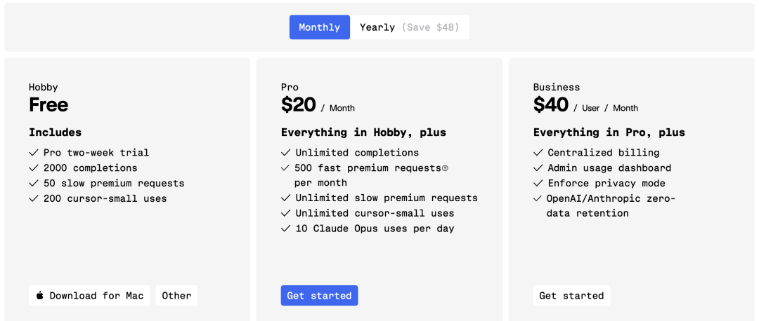 免費計劃(Hobby 計劃):用户可以免費體驗兩週,享受每月 2000 個代碼補全、50 個慢速優先的高級請求和 200 次使用 cursor-small 模型的數。