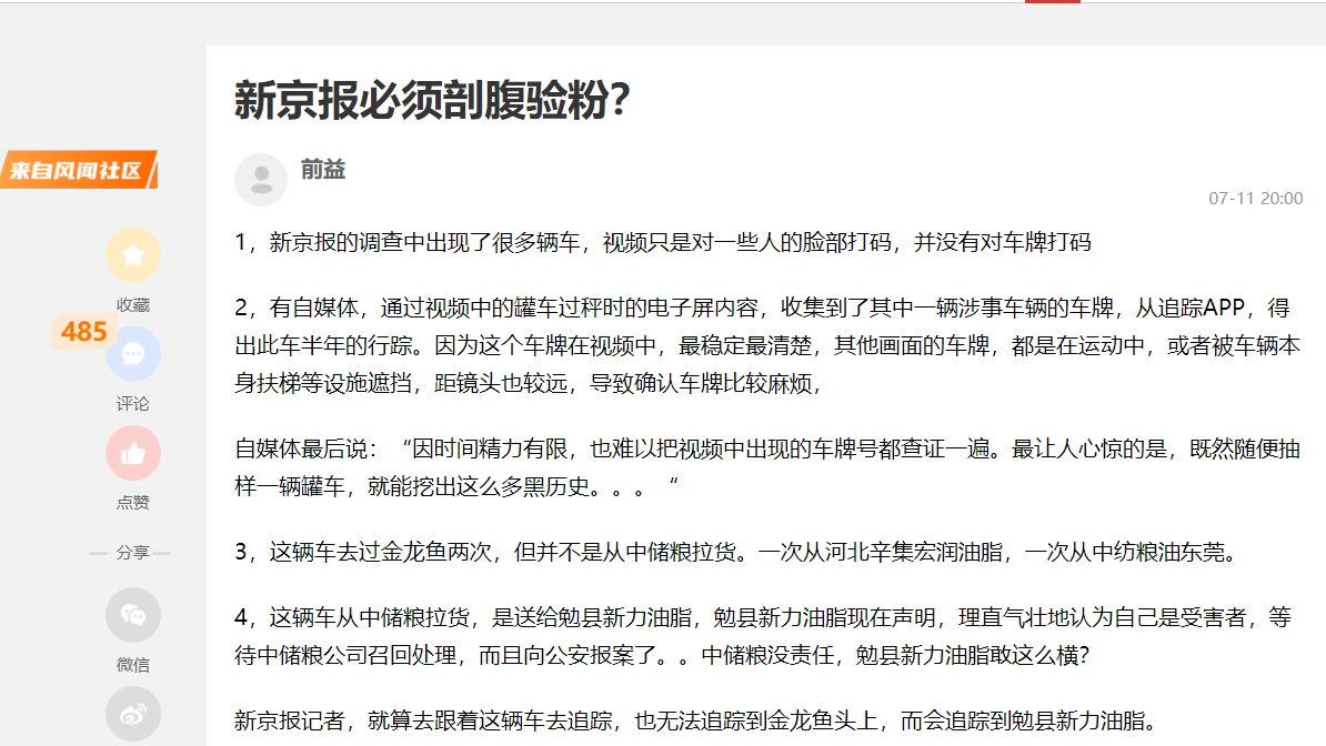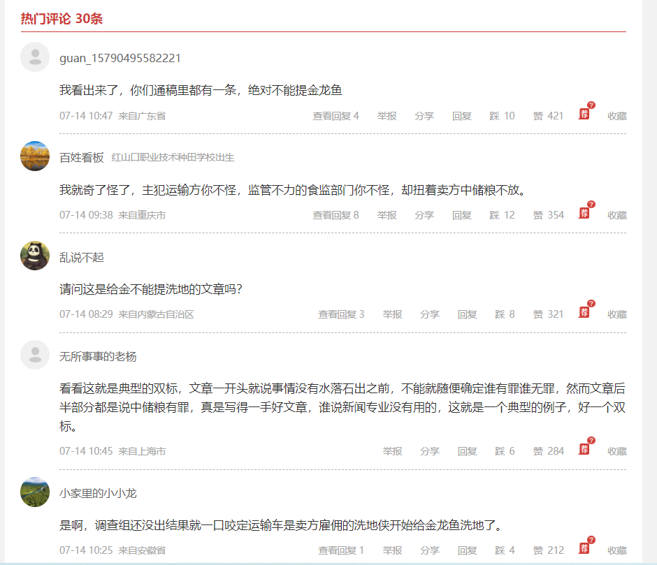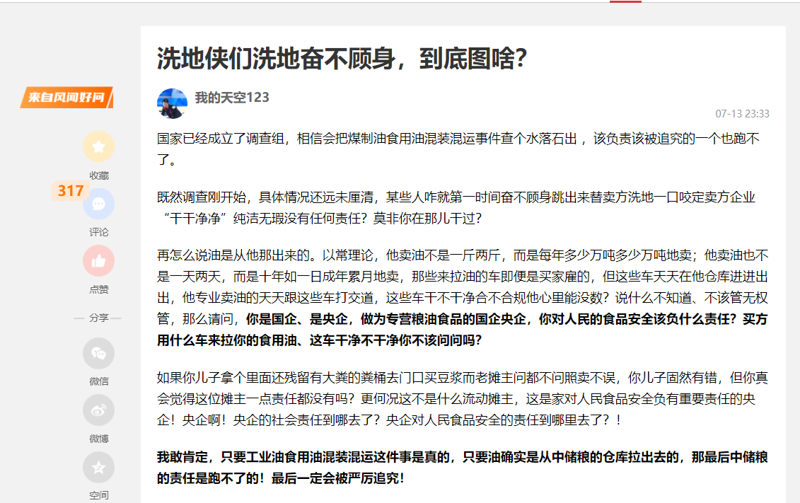 但是呢,在7月初,針對食用油混裝這個事件,引發了那麼多輿論,讓中儲糧、新京報,還有金龍魚都牽扯其中,本來是一個食品安全問題,結果輿論導向走偏,變成了立場問題,變成了外資什麼什麼問題,變成了某報什麼什麼問題……