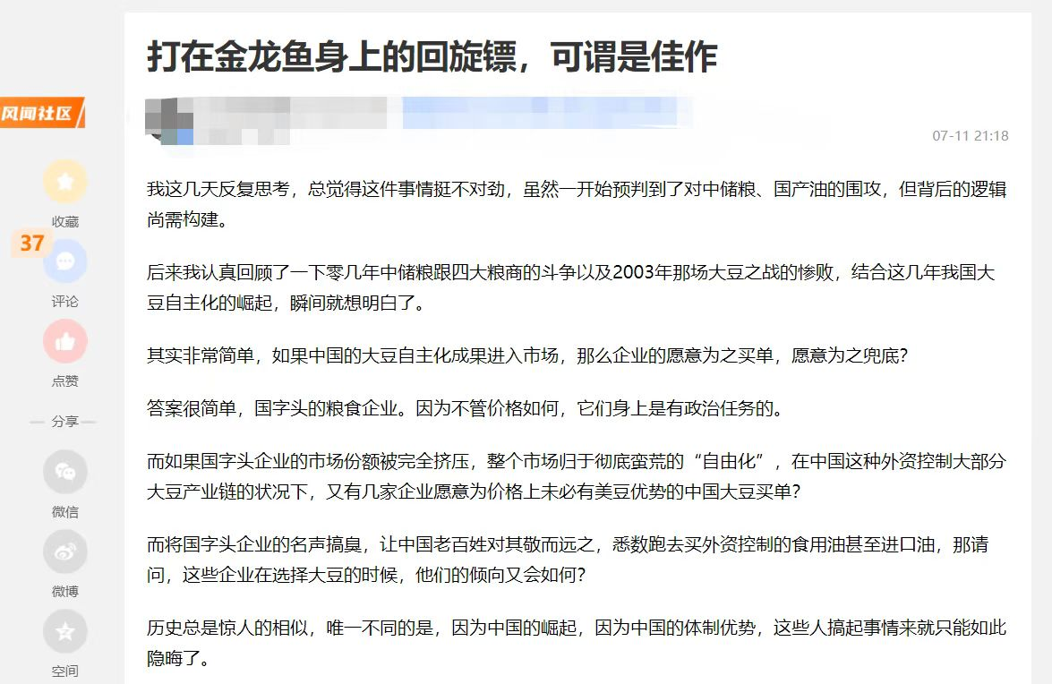 比如這篇文章,指向性就比較明確,“認真回顧了零幾年中儲糧跟四大糧商的鬥爭”