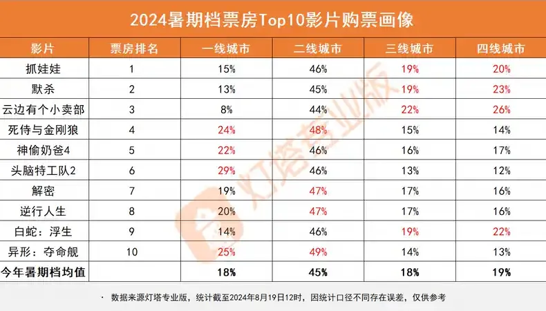 最關鍵的數據維度還是下沉市場,下沉市場早已成為電影票房的中流砥柱。今年暑期檔的票房前三名《抓娃娃》《默殺》《雲邊有個小賣部》均在三四線城市表現突出,佔比高於大盤,再次強調了“得下沉市場者得天下”的結論。