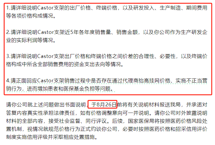 8月24日,針對國家醫保局此前的問詢,支架龍頭心脈醫療進行了回覆。