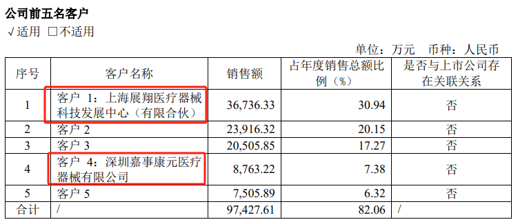 公司在2023年年報中公佈的前五大客户中,位列第一和第四的,是上海展翔醫療器械科技發展中心與深圳嘉事康元醫療器械有限公司,它們背後分別是九州通和嘉事堂,均為上市醫藥流通企業。
