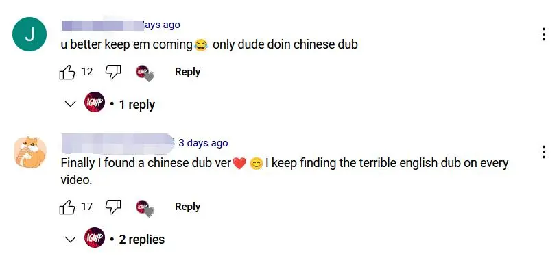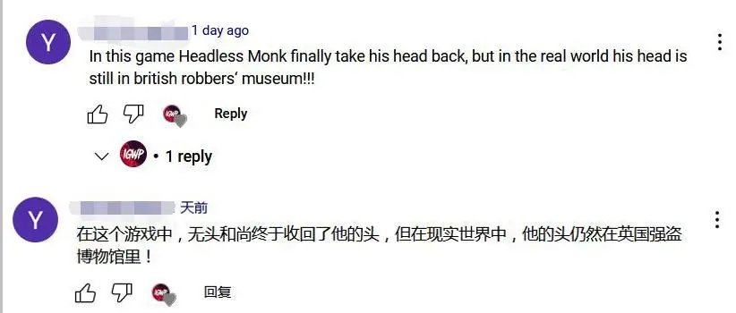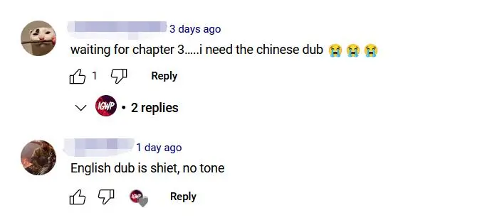 在油管的一箇中英文語音對照視頻中,就有英文母語玩家留言表示自己選擇中文語音英文字幕,就為了體驗原汁原味的中國風。有些玩家也會在錄播評論區留言希望主播下次錄視頻選擇中文配音。