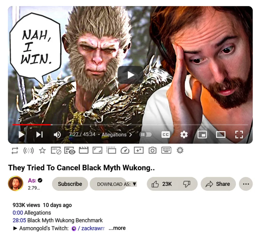 在油管上,由@Asmongold TV製作的兩期視頻《他們試圖取消黑神話悟空》《黑神話悟空正成為一個威脅》都取得了百萬播放量。