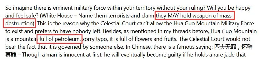 比如有一個帖子就試圖解釋:天庭為什麼執意要蕩平花果山?按樓主説法,那是因為天庭看上了花果山豐富的石油(劃掉)水果資源,然後以懷疑花果山藏有“大規模殺傷性武器”的名義出兵剿滅。評論區的回覆都表示瞬間明白西遊記是怎麼回事了。
