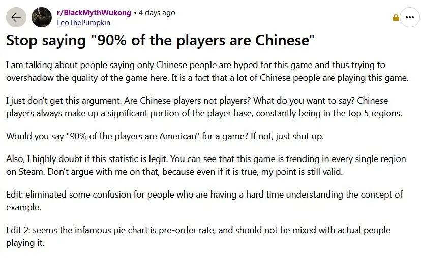 而在Reddit也有一個很具代表性的帖子,標題是《別再説90%的玩家都是中國人了》。