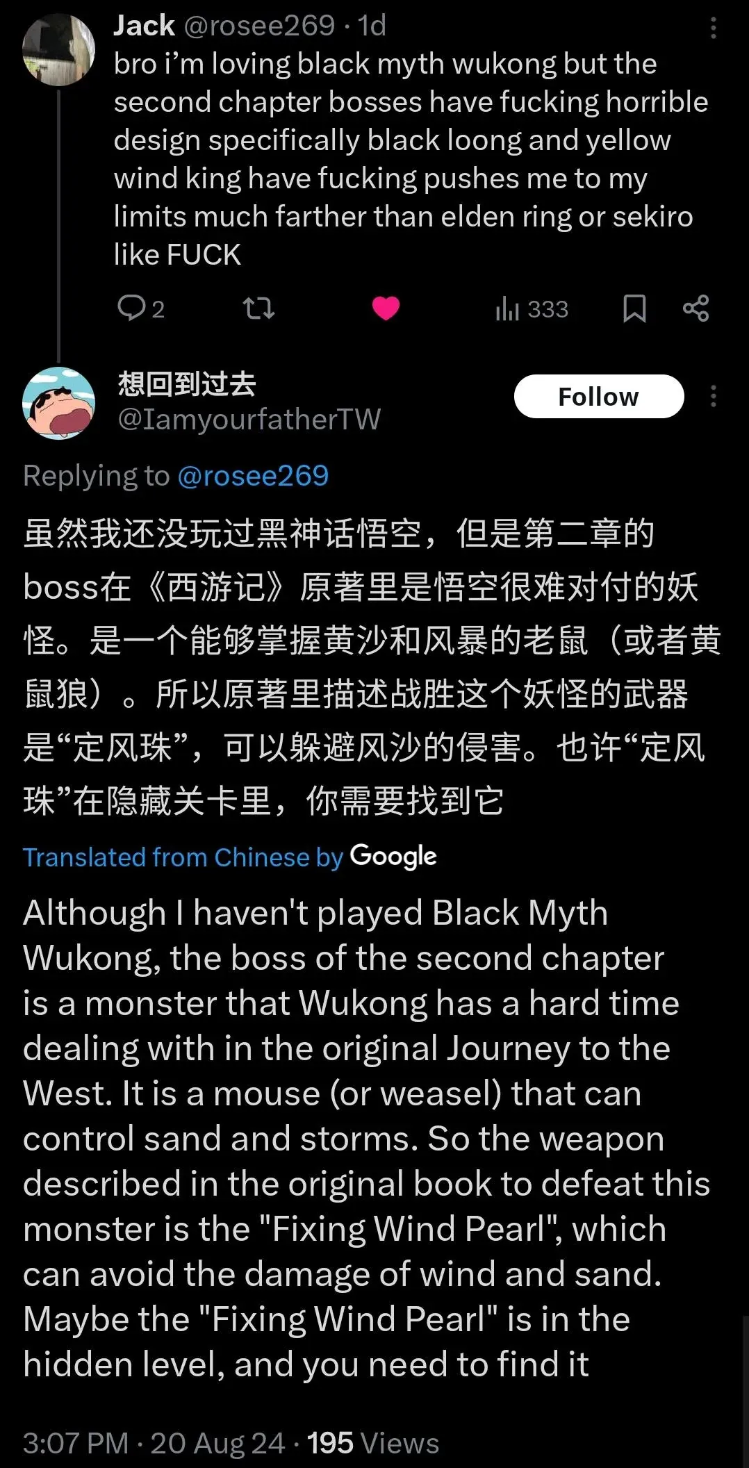 還有玩家在打不過第二章BOSS發貼訴苦的時候,卻意外收到回覆,有人告訴他《西遊記》原作中悟空是取得了定風珠這個寶物後才擊敗BOSS的。結果同樣的寶物就隱藏在遊戲中,取得寶物後應對BOSS就能輕鬆許多。