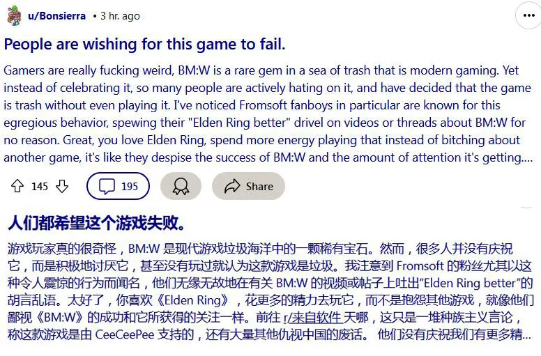在這個帖子下聚集了許多喜愛《悟空》的老外玩家。他們也感受到自己社區中的一股戾氣。看到《悟空》銷量不錯,總有人跳出來説“都只是中國人在買”“只不過中國人多罷了”,而並不願承認高銷量是遊戲本身品質的體現。而那些將《悟空》説成是中國對外文化侵略的言論也海外也很流行,尤其是在非玩家聚集的社區中,一切來自中國的東西都值得警惕,都可能毒害他們。