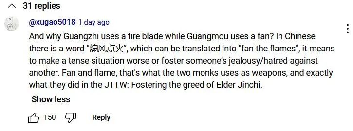 還有人解釋了為什麼金池長老的兩個手下拿的武器分別是扇子與火焰刀。那是因為中國有個成語“煽風點火”,比喻煽動別人鬧事。兩個手下的武器暗指他們曾經攛掇長老放火殺死唐僧搶奪寶物袈裟。這下老外玩家又在評論區學起了成語。