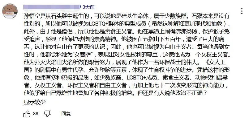 如果説《黑神話:悟空》在國內的爆發是吃到了大聖的情懷加成,那麼它在海外的流行則還有另一股隱形流量的加持,那就是這款遊戲從某種意義上成為海外玩家反對過渡政治正確與白左綁架的一面旗幟,成為海外玩家對抗媒體話語霸權的一柄武器。