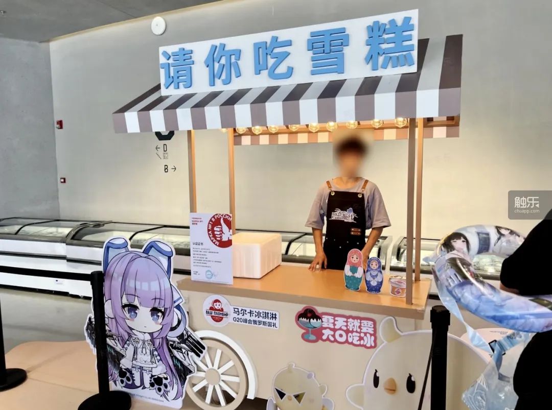 集章禮品有一項是冰淇淋兑換券,可以在指定地點換到聯名冰淇淋吃。兑換處兩旁是休息區,我覺得,這兒比內場更熱鬧。在內場,很多玩家只是默默排隊參加活動,默默看主舞台節目,默默給Coser拍照,場地的BGM震天響,他們還是把喜悦和滿足藏在心裏。