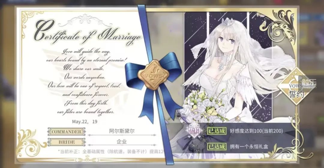 卡醬向我展示了他和柚的誓約界面。在《碧藍航線》中,角色有好感度系統,歷經陌生、友好、喜歡和愛,玩家最終可以和角色進行誓約,為角色戴上戒指。誓約後,角色的屬性會提升,還會解鎖特殊的裝扮。在卡醬的手機上,2018年1月24日的誓約日期格外矚目。