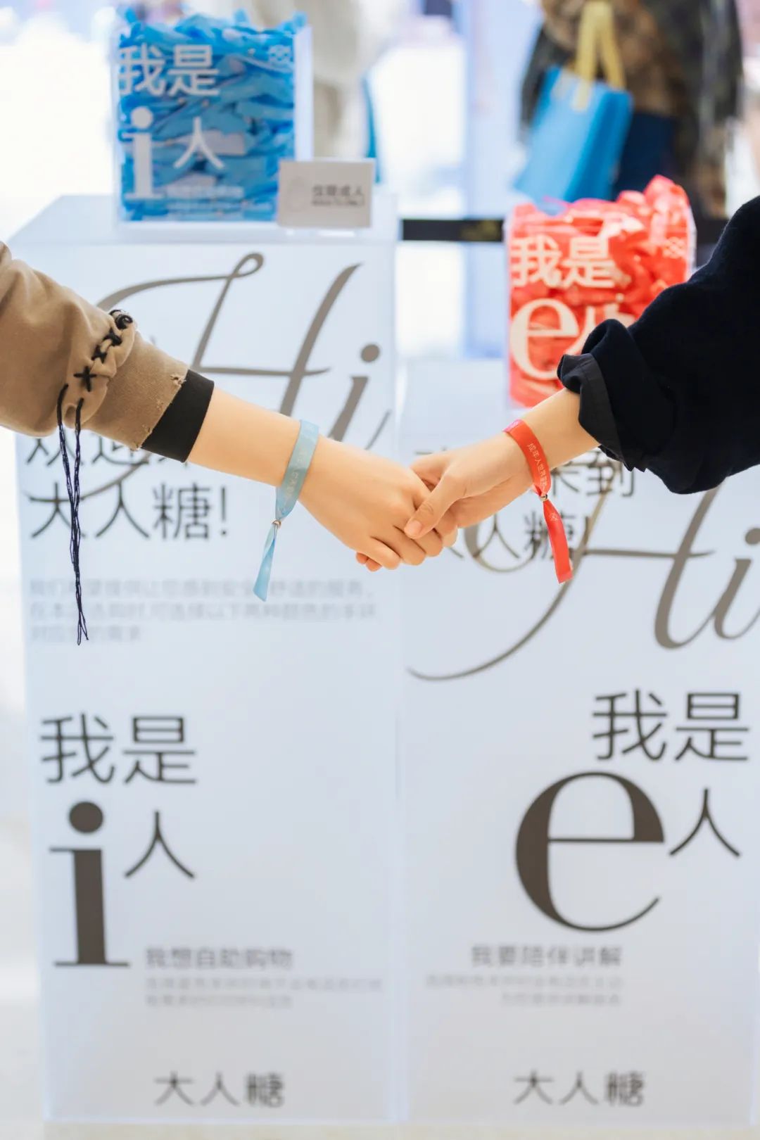 門店入口處均提供“i人”和“e人”兩種手環,消費者自主選擇是否需要導購員講解,讓消費者自在購物;門店內展示生理教具模型,循環播放性教育影片,引導消費者科學談性;購物袋logo版&無logo版可選打消尷尬顧慮。