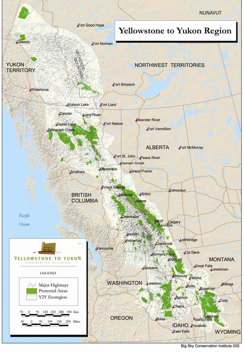 保護區太小了,人們需要從更大的尺度上觀看自然,並制定更加宏大的“戰略”。於是,在1993年,黃石到育空保護倡議(Yellowstone to Yukon Conservation Initiative,簡稱Y2Y)正式成立了。這是一個由生態保護組織、野生動物學家、生態學家等團體和個人組成的組織,是最早以保護大型景觀(large-landscape)為目標的環保組織之一。