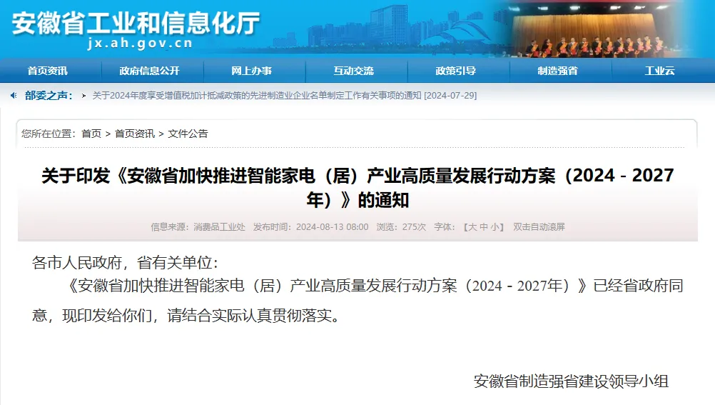 近日,安徽省工信廳發佈**《安徽省加快推進智能家電(居)產業高質量發展行動方案(2024-2027年)》**,從四個方面,實施八大工程。