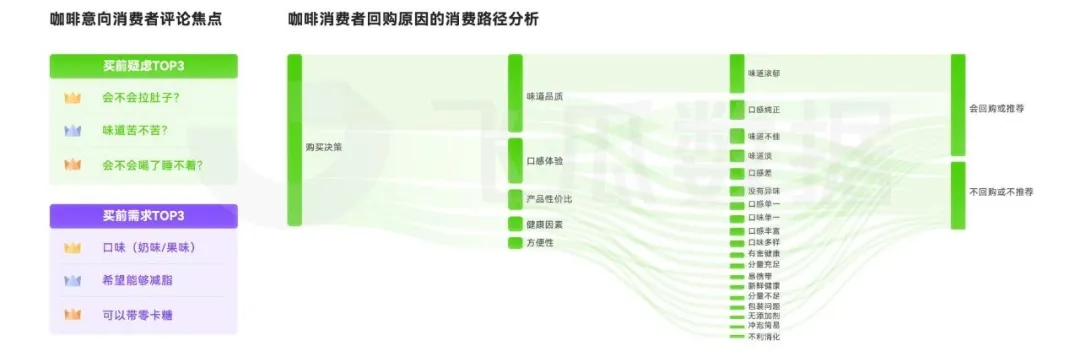 消費者在回購咖啡產品時,口感純正、味道濃郁 的產品有效促進了消費者的回購或推薦行為。而 口感單一、味道淡 則導致消費者不願意回購的重要原因,品牌應重點關注和提升咖啡的口感和味道。同時可以就消費者較為關心的方便性需求,從易於攜帶和沖泡的角度,進一步優化產品的包裝設計。