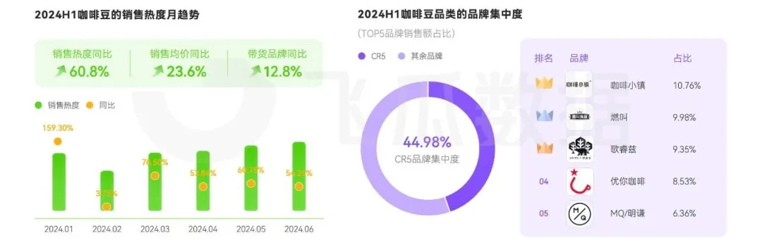 從2024上半年咖啡豆的銷售熱度來看,銷售熱度同比增長 60.8%,依舊保持兩位數的增長態勢。