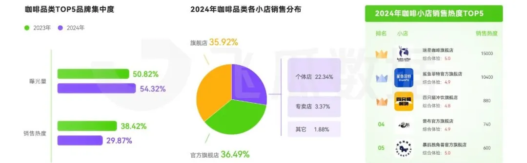 根據《2024中國城市咖啡發展報告》數據顯示,2023年中國咖啡產業規模達到2654億元,近三年年均複合增長率達17.14%。市場的蓬勃發展,也為品牌商家帶來了新的挑戰。根據飛瓜數據,同比2023上半年,2024年咖啡頭部品牌的曝光量更為集中,而銷售集中度卻下降10%。