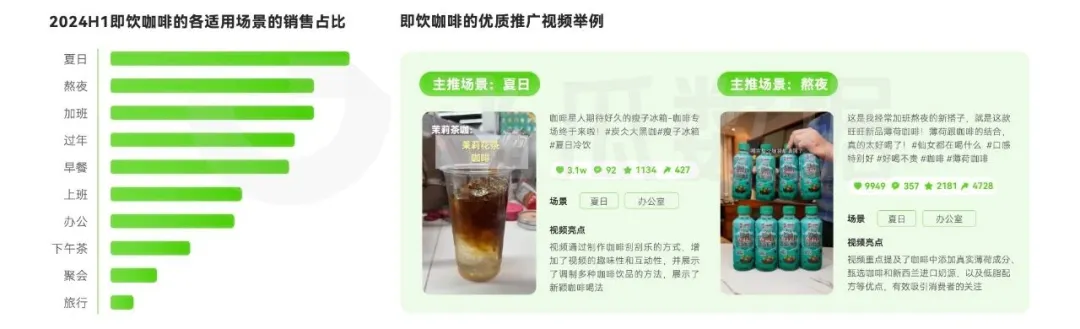 從即飲咖啡在各適用場景下的銷售佔比來看,夏日、熬夜、加班 成為銷售佔比最高的場景TOP3。其中,熬夜加班、下午茶、上班 等辦公相關的場景整體的熱度都較高。