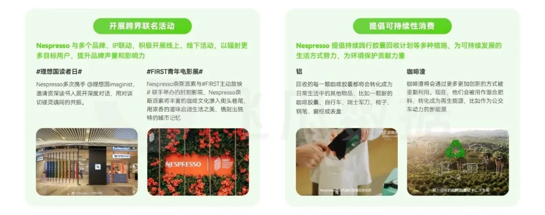 除了話題營銷以外,「NESPRESSO/奈斯派索」多個品牌、IP聯動,積極開展線上、線下活動,以輻射更多目標用户,提升品牌聲量和影響力。同時,「NESPRESSO/奈斯派索」也在 綠色環保 方面下足功夫,提倡持續踐行膠囊回收計劃等多種措施,為可持續發展的生活方式努力,為環境保護貢獻力量。