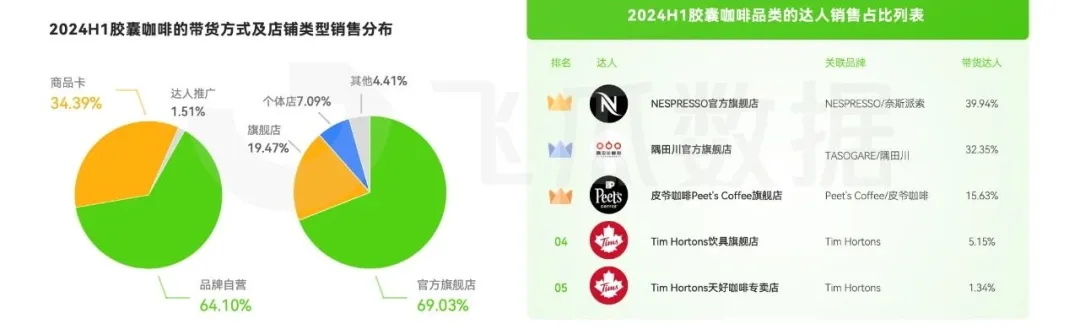 膠囊咖啡的帶貨方式主要以品牌自營為主,銷售佔比達到 64%,其次是來自商城、搜索等商品卡趨勢,佔比達到 34%。膠囊咖啡機通常價格較高,消費者出於對產品質量和售後服務的考量,更傾向於在品牌自營號和官方旗艦店購買,同時官方賬號往往能提供更專業的產品介紹和使用指南,也能幫助消費者更好地瞭解和使用產品。