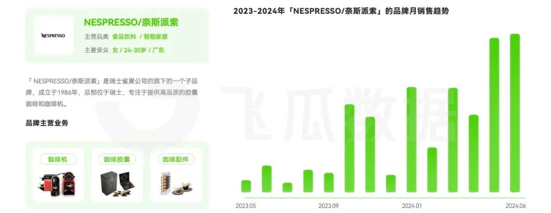 從2024上半年膠囊咖啡的銷售熱度來看,銷售熱度同比增長 226.8%,曝光量同比增長 168.2%。消費者對於高品質咖啡的追求越來越高,這有效推動了膠囊咖啡銷售增長,膠囊咖啡能夠在保證品質和簡單操作的同時,提供便捷和個性化的選擇,更適應現代人快節奏、追求品質生活的需求。