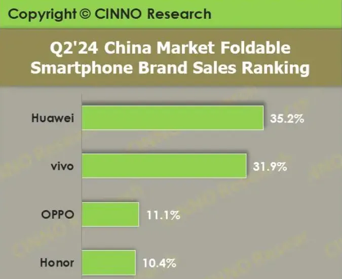 儘管OPPO很快對此予以否認,並表示OPPO對摺疊屏技術的開發沒有任何改變。但新品的遲遲未見已經對市場份額產生了影響,8月21日,市調機構CINNOResearch公佈了2024年Q2中國摺疊屏銷量榜,總銷量為262萬台,同比增長達到了125%。華為的銷量約為92.2萬台,市場份額為35.2%;vivo的銷量為83.6萬台,市場份額為31.9%;OPPO的銷量僅為29.1萬台,市場份額為11.1%,並且與排在第四位的榮耀僅相差0.7%的市場份額。