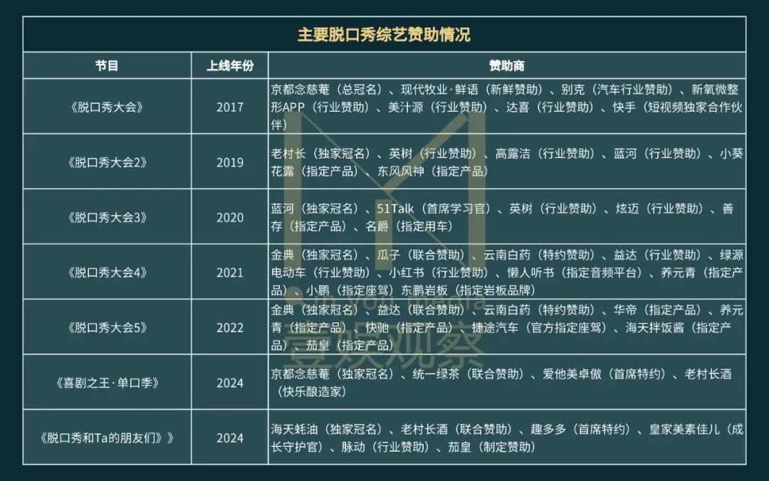內容熱了,脱口秀節目的吸金能力也讓今年整體招商情況並不太好的綜藝市場熱了一把。《喜單》和《脱友》分別吸引了4家和6家贊助商青睞,且多個品牌仍在持續入場。