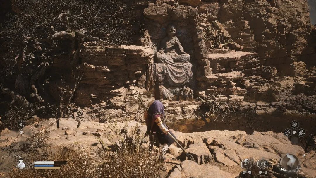 但對於《黑神話》來説,這種邊邊角角的景觀實在太多了。路邊隨處一抬頭,就能看到一尊全遊戲中獨一無二的佛像;再走兩步,又是一大面看起來很有故事的千佛石雕牆,但其實它們都是一個連精英怪都捨不得放的普通拐角。