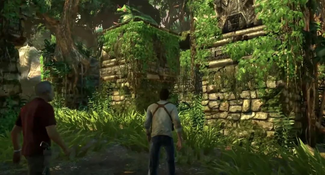 頑皮狗的概念與環境藝術設計師Robh Ruppel介紹,在遊戲的第二章,為了做到真實可信這個預設目標,他們在地圖上下了很多功夫。周身長滿青苔的巨樹,滿地茂盛的野草,還有被綠藤包裹的石柱,都讓整張地圖放眼望去一片綠。利用極為茂密的植被,他們成功讓玩家相信,這片古代廢墟的確隱藏在深山老林多年未被發現。
