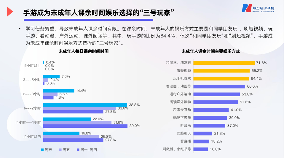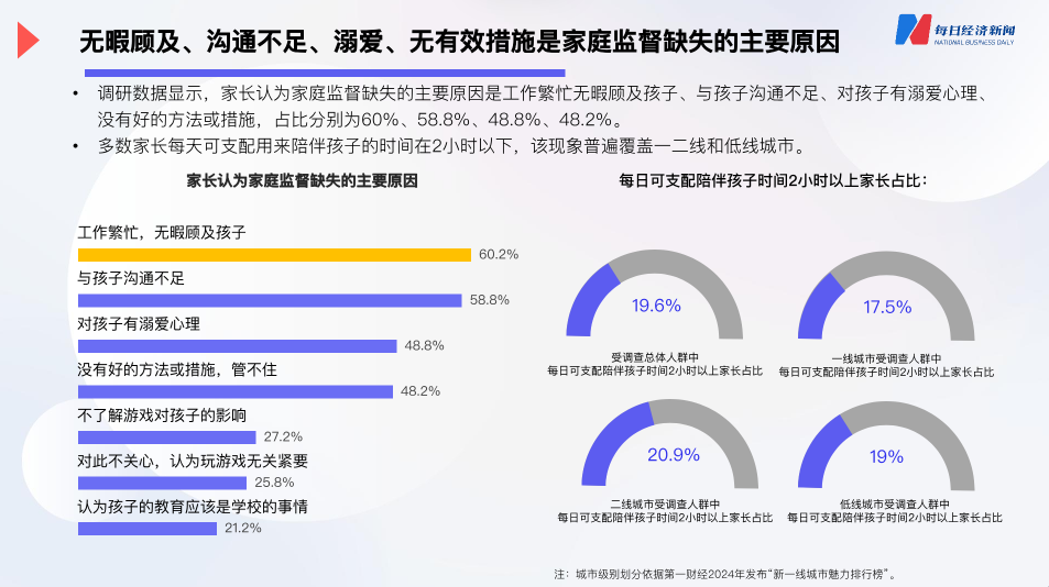 家長因為工作繁忙導致的陪伴缺失和家庭監管缺失,未成年人缺少相對較長而完整的時間投入高質量娛樂,二者相加也從側面為防沉迷政策的推進帶來了一些阻礙。