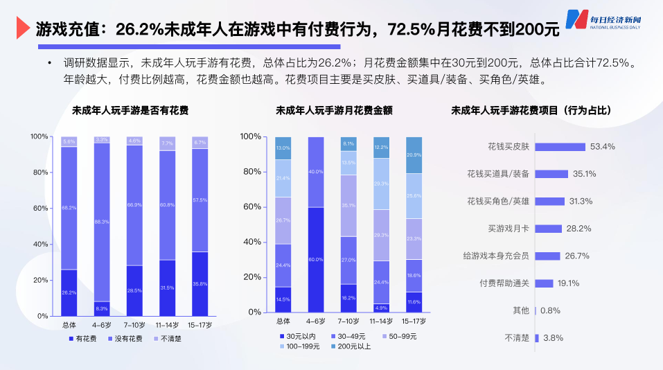 在充值方面,數據顯示玩手遊且在遊戲中有過消費的未成年人佔比為26%,月消費金額集中在30元到200元。