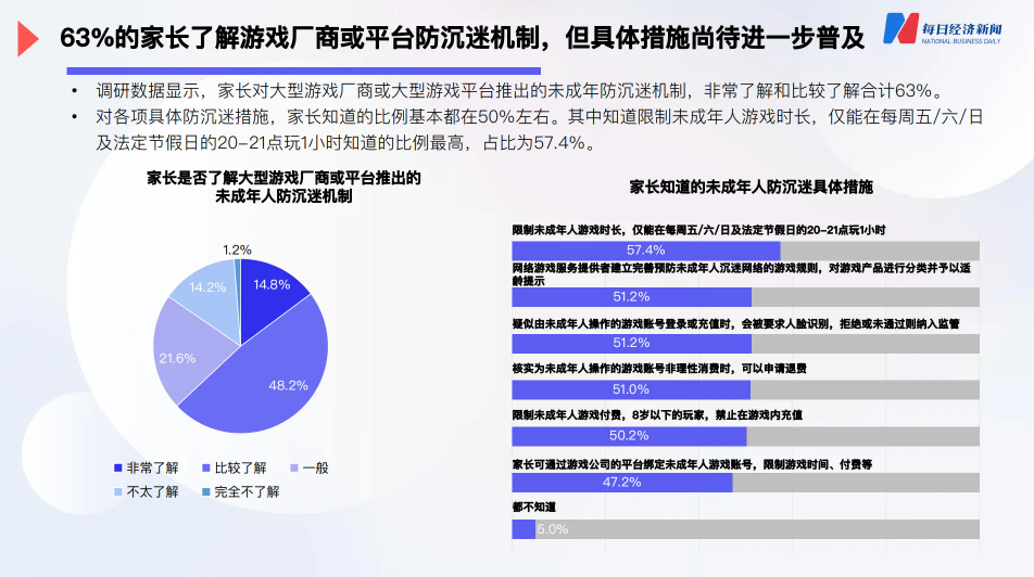 除此之外,即便家長有心管理孩子,遊戲廠商也提供了不少監護工具,但考慮到一些家長的年齡和他們對互聯網的認知程度,恐怕也只是有心無力。在調研報告中,對廠商所提供的防沉迷機制有所瞭解的家長僅佔比63%,而知曉各項工具具體使用方法、能夠自行操作的家長應無疑只會更少。