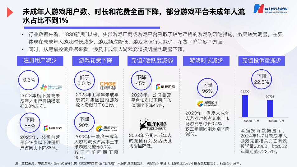 隨着政策的實施,近年來我們的確能夠切身感受到一些變化,像是遊戲中的未成年數量在減少,網上關於未成年人監護人與遊戲公司發生糾紛的新聞報道也少了很多。另外一方面,一些我們無法切身感受到的具體數據也在發生變化。