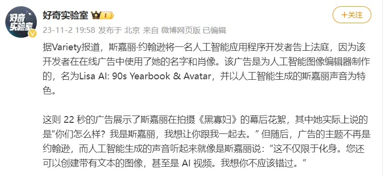 斯嘉麗前幾天告了一名AI程序開發者,因為對方直接用她的形象和聲音來打廣告。