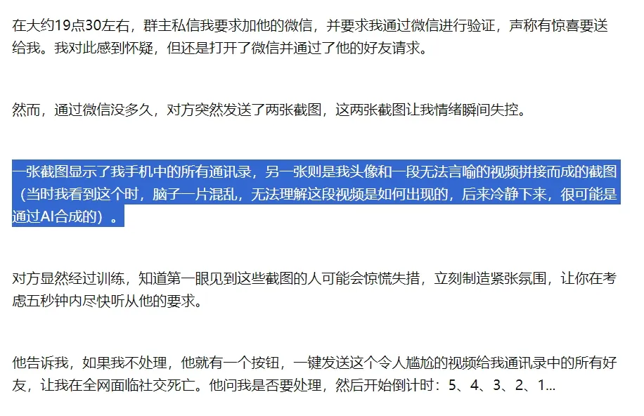 騙子截取到他的人臉識別視頻,然後利用AI換臉技術,拼接出一段裸聊視頻,然後威脅當事人要把這視頻羣發給他的通訊錄好友們。
