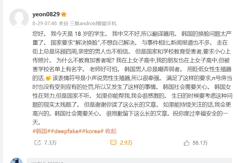境外網站的隱蔽性讓他們有恃無恐,而這種心態讓韓國女性相當憤怒。所以一羣韓國女生註冊微博,呼籲外國人關注韓國正在發生的事情。