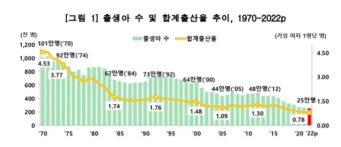 ● 綠色是出生人口數,黃色是總和生育率。圖片來源:韓國統計局