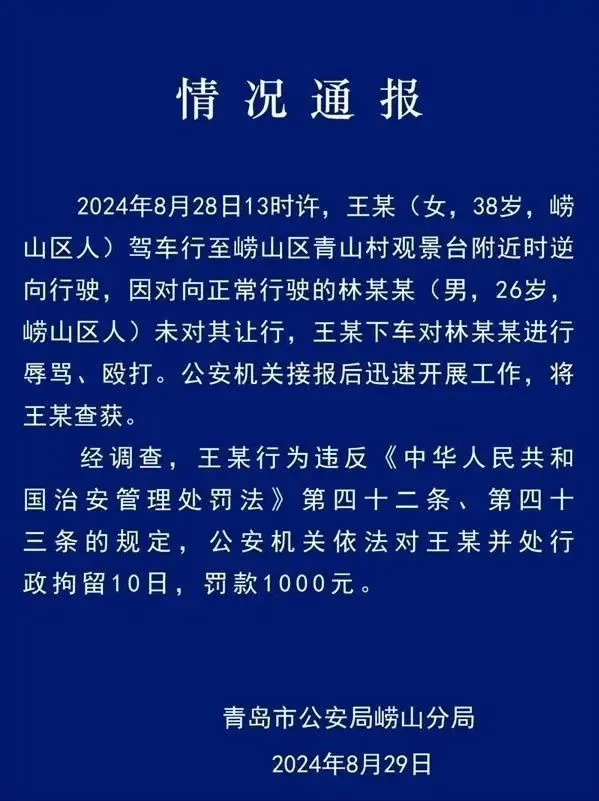 面對輿論壓力,當地警方迅速做出回應。8月29日,嶗山區警方發佈通報稱,38歲的王某因其行為被處以1000元罰款並行政拘留10天。