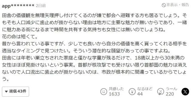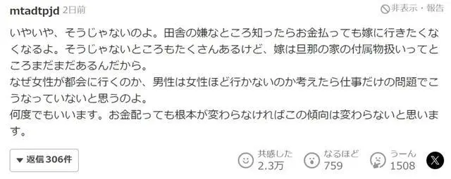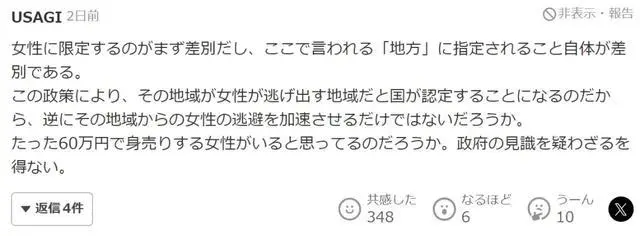 這就是為什麼日本政府試探性放出消息,將在明年實行“單身女性移居鄉下,給60萬補貼”政策,看着挺好呀,卻被罵得老慘。