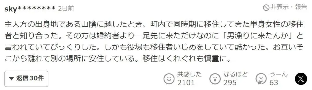 她只是比她未婚夫先行一步搬了過來,就被人説“來物色男人的吧”。嚇我一跳。而且,就連村公所,也欺負移居者欺負得很過分。我和她都離開那裏,在別的地方定居下來。